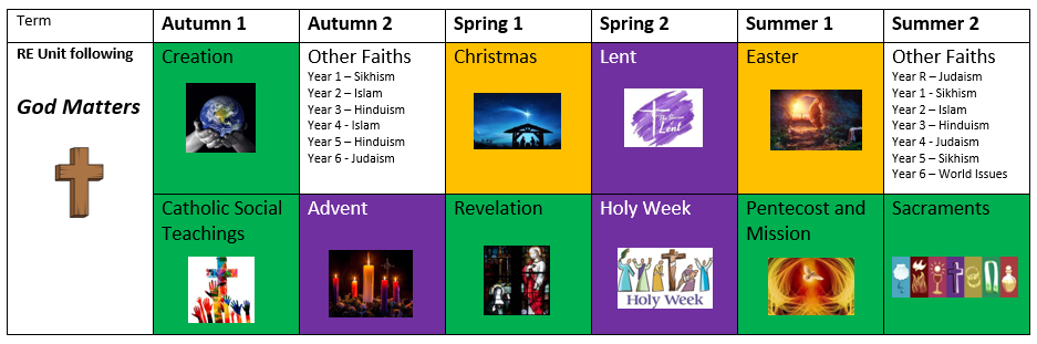As a Catholic School, RE is a core subject and accounts for 10% of our curriculum. We follow the curriculum of God Matters as we are part of the Porsmouth diocese. Below you will see the units we cover and link to the God Matters curriculum.
